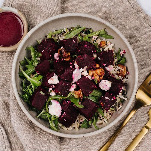 Beetroot (33%), brown rice (25%), balsamic dressing (balsamic vinegar [sulphites], canola oil, beetroot, raw sugar, orange juice, extra virgin olive oil, Himalayan pink salt, pepper, vegetable gum [xanthan gum]), quinoa (10%), cauliflower (7%), rocket, candied walnut (4%), fetta cheese (4%) (milk), mint leaves.