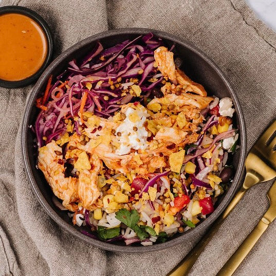 Chicken (20%) (free range chicken [90%], chicken marinade [10%] [tomato paste, canola oil, paprika, Himalayan pink salt, natural chicken stock, garlic, chilli flakes, extra virgin olive oil]) jasmine rice, cabbage, chipotle dressing (12%) (chipotle in adobo sauce, canola oil, red onion, apple cider vinegar, raw sugar, garlic, shio koji, Himalayan pink salt, extra virgin olive oil, thyme, vegetable gum [xanthan gum], red wine vinegar [sulphites]), black bean, carrot, cottage cheese (milk), jalapeno, corn, tortilla chips, capsicum, pickled onion, red onion, coriander seeds, fresh coriander, Himalayan pink salt, garlic crisps, chilli flakes
