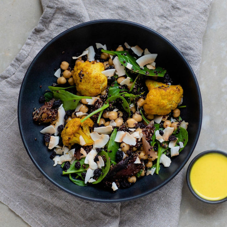 Roasted cauliflower (31%) (Cauliflower, spices, canola oil, extra virgin olive oil), quinoa (28%), roasted chickpeas (11%) (chickpea, lemon juice, canola oil, Himalayan pink salt, extra virgin olive oil), tahini dressing (10%) (lemon juice, tahini paste [sesame], water, canola oil, maple syrup, panela sugar, extra virgin olive oil, Himalayan pink salt, cumin seed), spinach, coconut and currant mix, roasted red onion (red onion, lemon juice, raw sugar), coriander