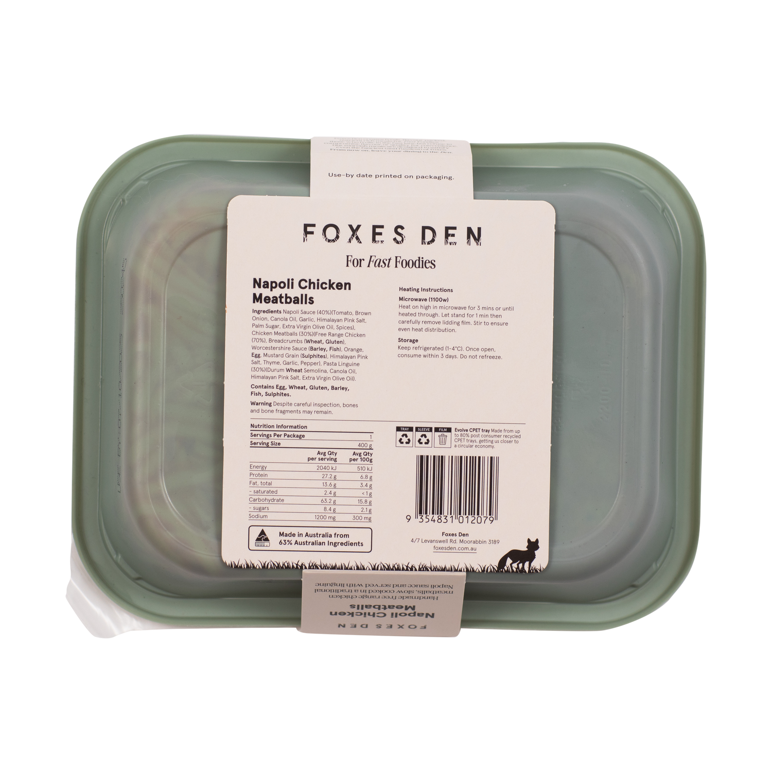 Napoli sauce (40%) (tomato, brown onion, canola oil, garlic, Himalayan pink salt, palm sugar, spices), pasta linguine (30%) (durum wheat semolina, Himalayan pink salt), chicken meatballs (30%) (free range chicken (21%) breadcrumbs (wheat), Worcestershire sauce (barley, fish), orange, egg, mustard grain, Himalayan pink salt, thyme, garlic, pepper