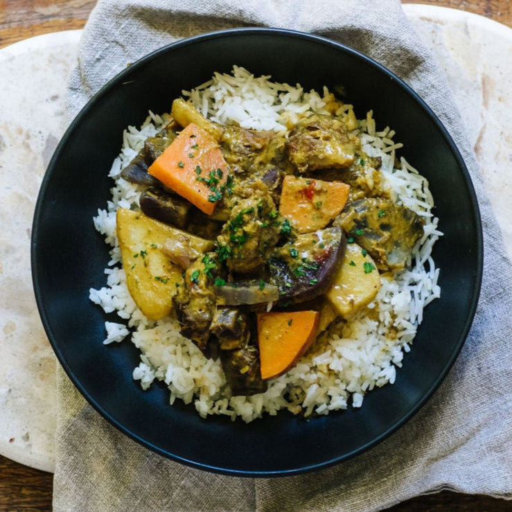 Jasmine rice (34%), lamb (15%), chicken stock (water, natural chicken stock), coconut milk, purple sweet potato (7%), sweet potato (6%), potato (6%), onion, canola oil, lemongrass (2%), chilli, black pepper, sugar, fish sauce, curry powder (turmeric, dried chilli, star anise, fennel, cumin, cloves, cinnamon, bay leaf, coriander seed, dried garlic, black cardamon, annatto seed, pepper, Szechuan pepper, nutmeg), plain flour (wheat), garlic, ginger, Himalayan pink salt, kaffir lime leaves, coriander ground.