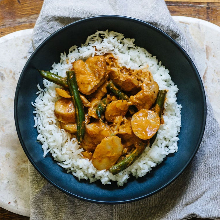 A rich, creamy Thai curry with free-range chicken, potatoes, green beans and lychees, served with rice.