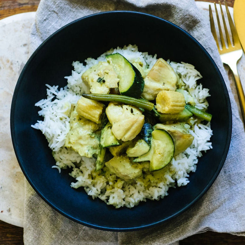 An authentic Thai curry with zucchini, green beans and kaffir lime leaf. Served with rice.