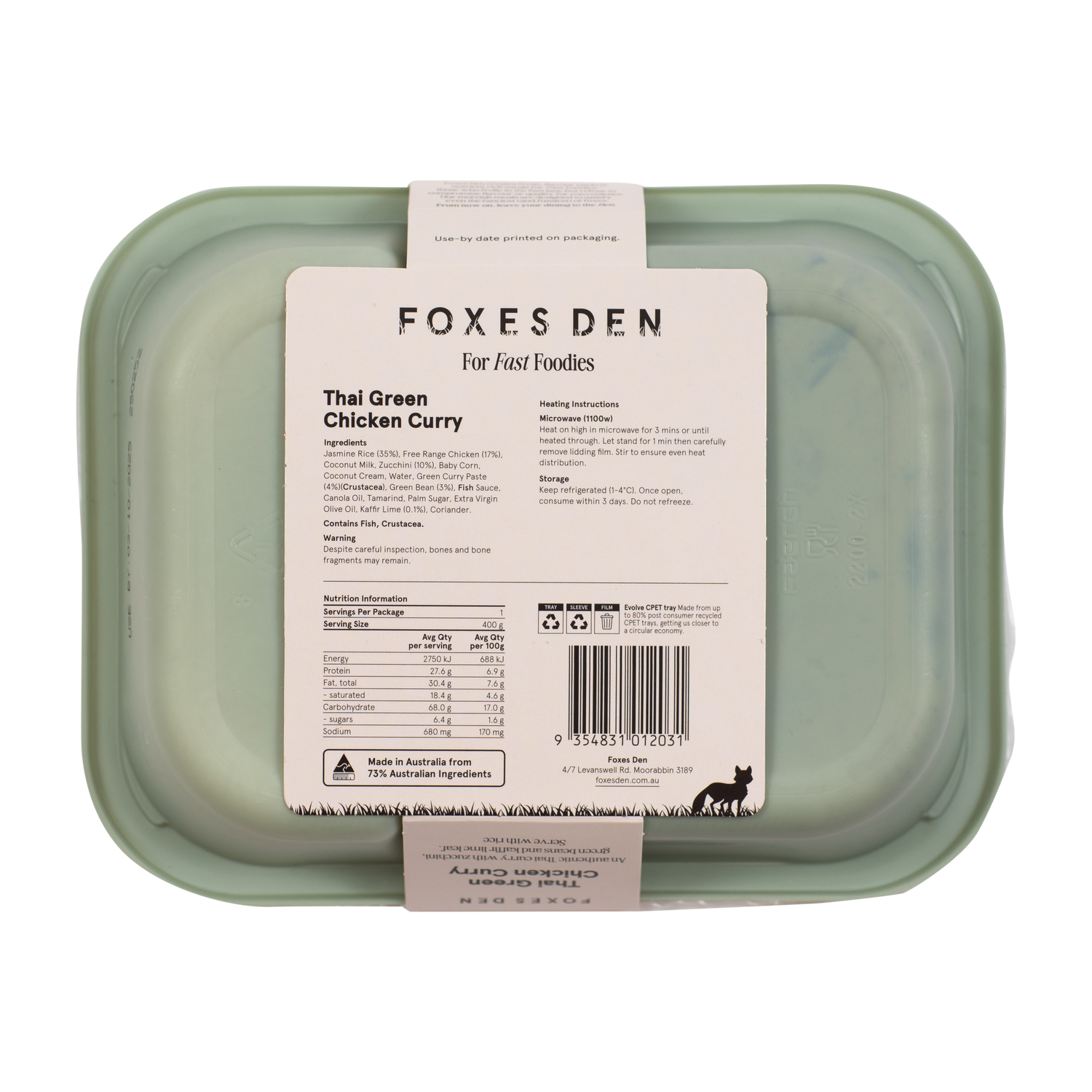This is the best green Thai curry I have tasted - anywhere. It's my favourite Foxes Den meal, and I don't let myself have it all the time because I don't want to get sick of it!