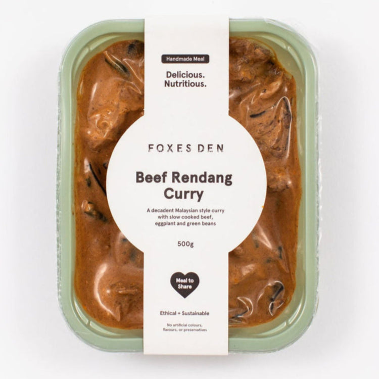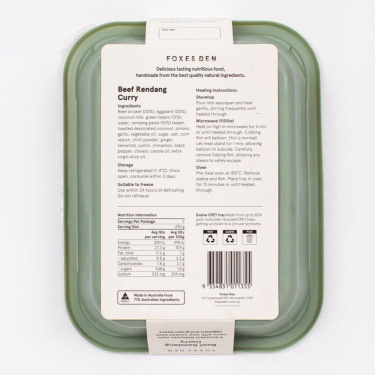 Jasmine rice, beef brisket (19%), eggplant (12%), coconut milk, green beans (8%), water, rendang paste (6%) (water, toasted desiccated coconut, onions, garlic, vegetable oil, sugar, salt, corn starch, chilli powder, ginger, tamarind, cumin, cinnamon, black pepper, cloves), canola oil, extra virgin olive oil