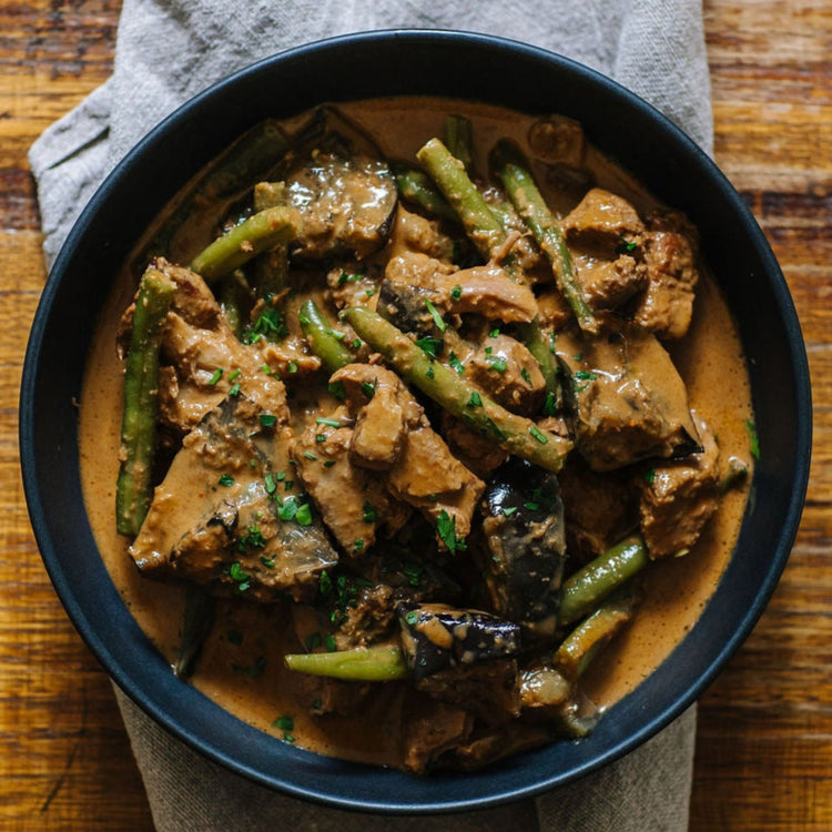 A decadent Malaysian style curry with slow cooked beef, eggplant and green beans