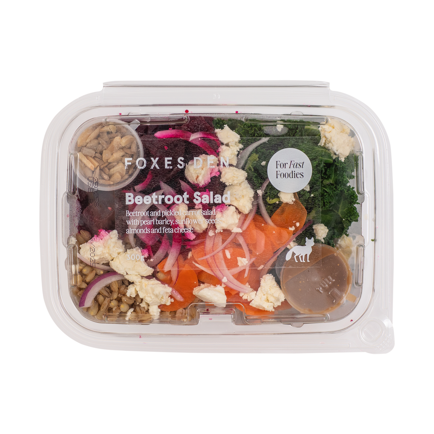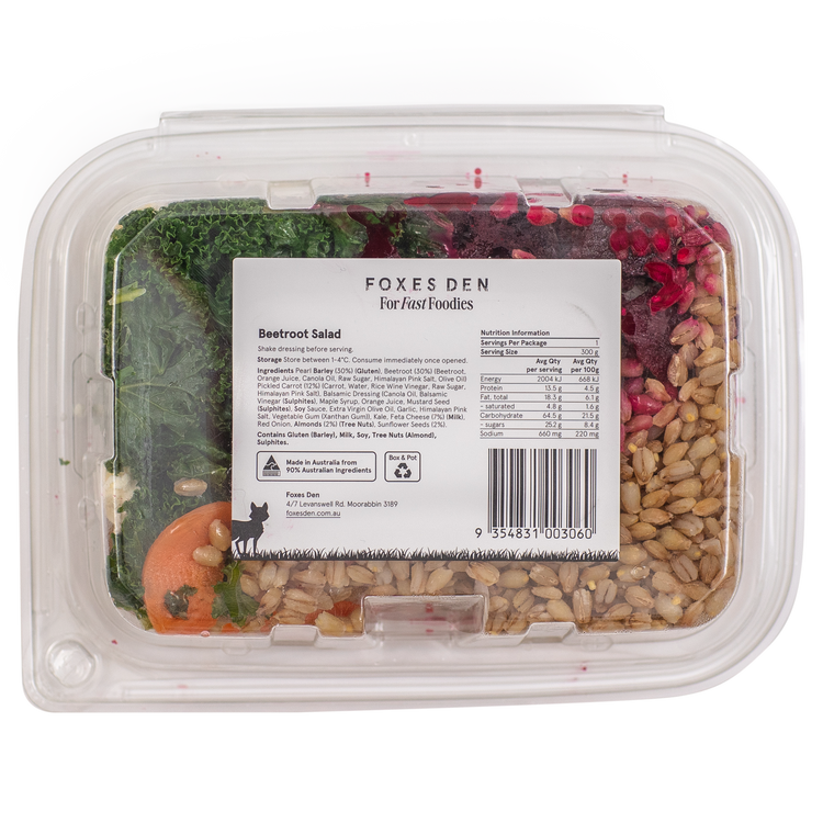 Pearl Barley (30%) (Gluten), Beetroot (30%) (Beetroot, Orange Juice, Canola Oil, Raw Sugar, Himalayan Pink Salt, Olive Oil), Pickled Carrot (12%) (Carrot, Water, Rice Wine Vinegar, Raw Sugar, Himalayan Pink Salt), Balsamic Dressing (Canola Oil, Balsamic Vinegar (Sulphites), Maple Syrup, Orange Juice, Mustard Seed (Sulphites), Soy Sauce, Extra Virgin Olive Oil, Garlic, Himalayan Pink Salt, Vegetable Gum (Xanthan Gum)), Kale, Feta Cheese (7%) (Milk), Red Onion, Almonds (2%) (Tree Nuts), Sunflower Seeds (2%).