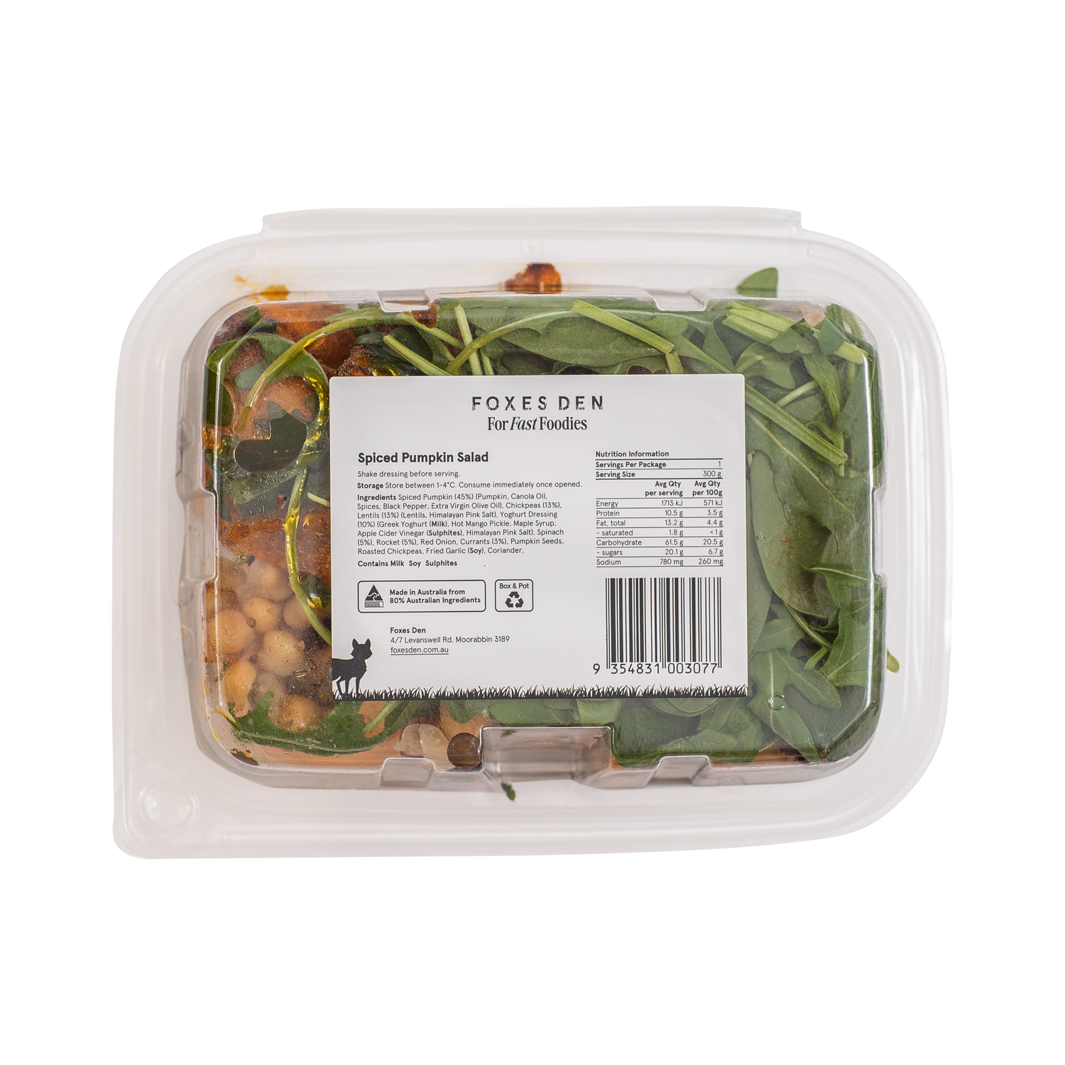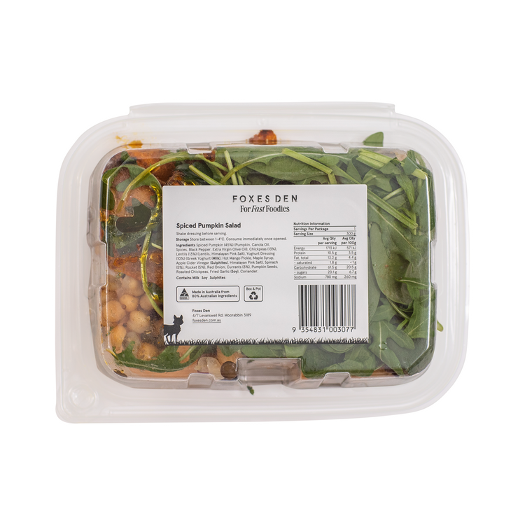 Spiced Pumpkin (45%) (Pumpkin, Canola Oil, Spices, Black Pepper, Extra Virgin Olive Oil), Chickpeas (13%), Lentils (13%) (Lentils, Himalayan Pink Salt), Yoghurt Dressing (10%) (Greek Yoghurt (Milk), Hot Mango Pickle, Maple Syrup, Apple Cider Vinegar (Sulphites), Himalayan Pink Salt), Spinach (5%), Rocket (5%), Red Onion, Currants (3%), Pumpkin Seeds, Roasted Chickpeas, Fried Garlic (Soy), Coriander.
