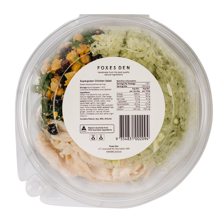 Green rice (jasmine rice, spinach, natural vegetable stock), free-range chicken (22%), peanut miso dressing (peanut butter, pickle, water, miso paste [soy], garlic, raw sugar), chickpea, currant, kale (3%), pumpkin seed, fetta cheese (milk), almond, soy sauce, spring onion, lemon juice, ginger, canola oil, natural chicken stock, Himalayan pink salt, extra virgin olive oil