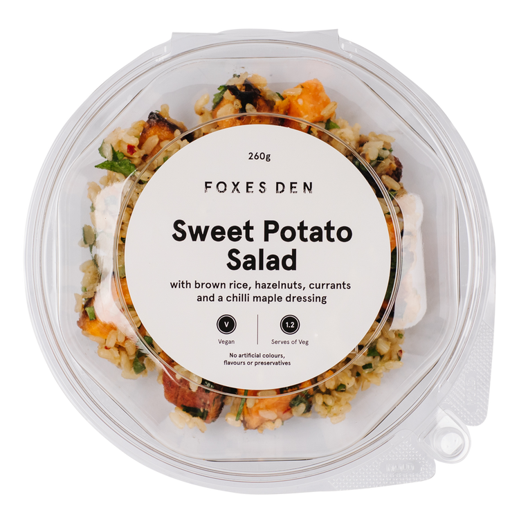 Brown rice (44%), sweet potato (32%), chilli maple dressing (12%) (orange juice, canola oil, maple syrup, ginger, apple cider vinegar, extra virgin olive oil, lemon, Himalayan pink salt, chilli flakes, spices, vegetable gum [xanthan gum]), hazelnuts and currant mix (9%), spring onion, parsley, coriander, canola oil, Himalayan pink salt, pepper, extra virgin olive oil.