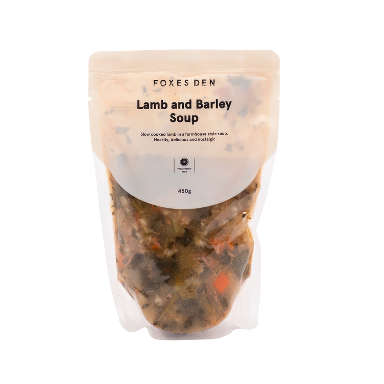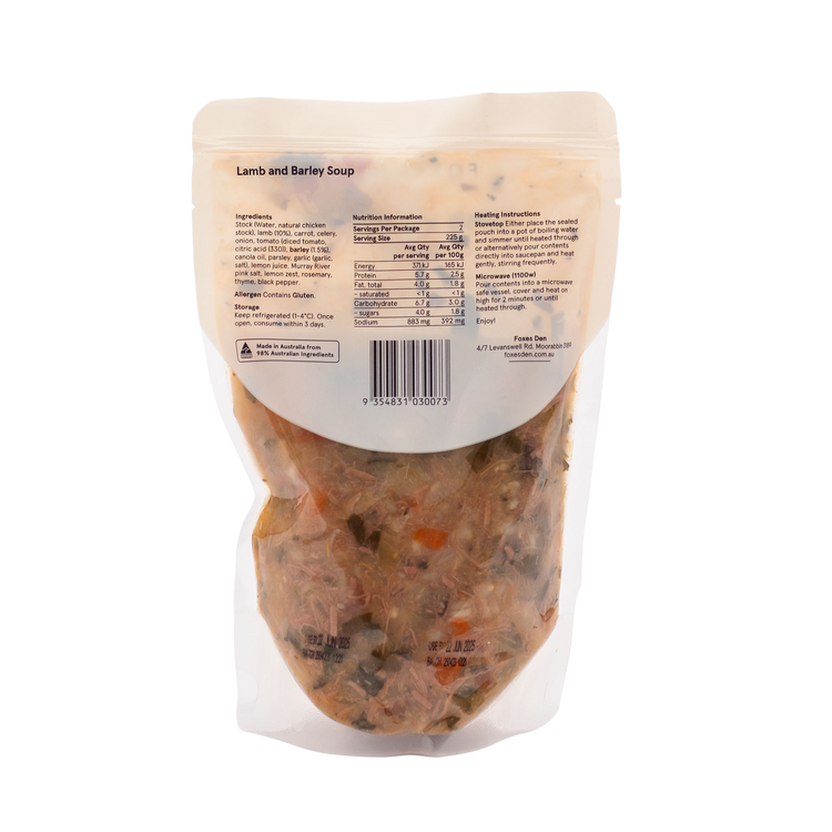 Stock (Water, natural chicken stock), lamb (10%), carrot, celery, onion, tomato (diced tomato, citric acid (330)), barley (1.5%), canola oil, parsley, garlic (garlic, salt), lemon juice, pink salt, lemon zest, rosemary, thyme, black pepper.