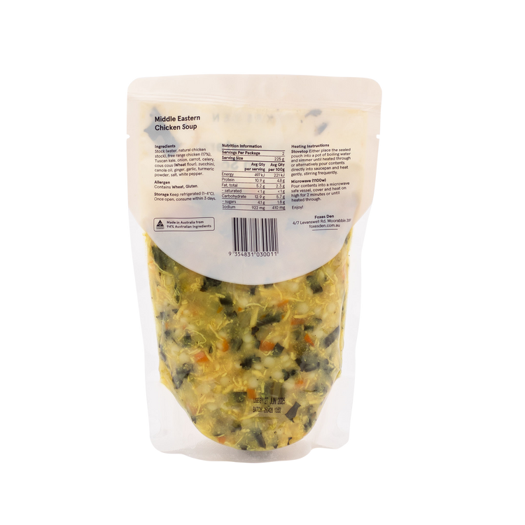Stock (Water, natural chicken stock), free range chicken (17%), Tuscan cabbage, onion, carrot, celery, cous cous (Wheat flour), zucchini, canola oil, ginger (ginger, vinegar, vegetable oil, salt, lactic acid), garlic (garlic, salt), turmeric powder, salt, white pepper.