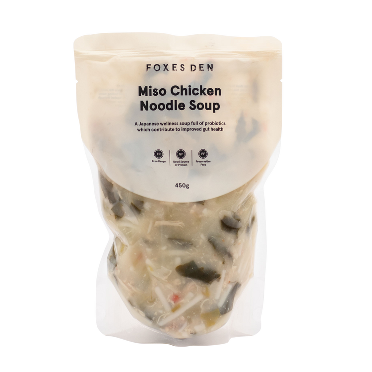 Stock (Water, natural chicken stock), free range chicken (14%), bok choy, udon noodle (6%) (organic wheat flour, salt, water), lemongrass, ginger (ginger, vinegar, vegetable oil, salt, lactic acid), miso paste (1%) (water, soybeans, rice, salt, alcohol), spring onion, garlic (garlic, salt), kaffir lime leaves, salt, chilli.