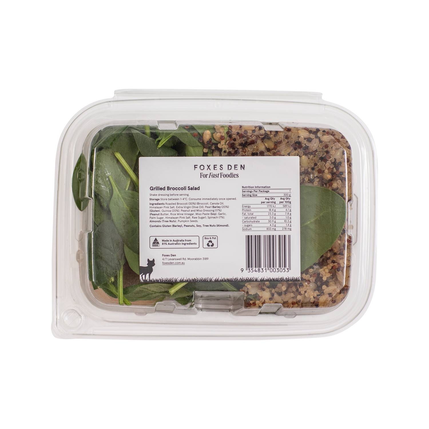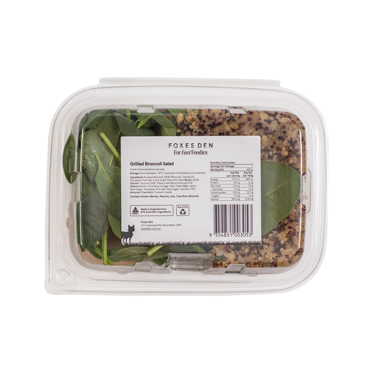 Roasted Broccoli (30%) (Broccoli, Canola Oil, Himalayan Pink Salt, Extra Virgin Olive Oil), Pearl Barley (20%) (Gluten), Quinoa (20%), Peanut and Miso Dressing (17%) (Peanut Butter, Rice Wine Vinegar, Miso Paste (Soy), Garlic, Palm Sugar, Himalayan Pink Salt, Raw Sugar), Spinach (7%), Almonds (Tree Nuts), Pumpkin Seeds