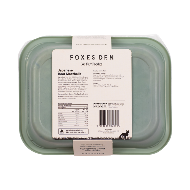 Nori Rice (44%)(Sushi Rice, Sesame Seed, Canola Oil, Nori, Sugar, Sesame Oil), Beef Meatballs (25%)(Beef Minced, Eggs, Soy Sauce, Breadcrumbs (Wheat, Gluten), Mirin, Garlic, Ginger, Sesame Oil, Black Pepper), Daikon (6%), Mirin, Dashi (Water, Kombu, Bonito Flakes (Fish)), Soy Sauce, Honey, Spring Onion, Ginger, Sesame Oil, Garlic, Corn Flour, Sesame Seed, Sweet Soy Sauce, Sake, Himalayan Pink Salt.