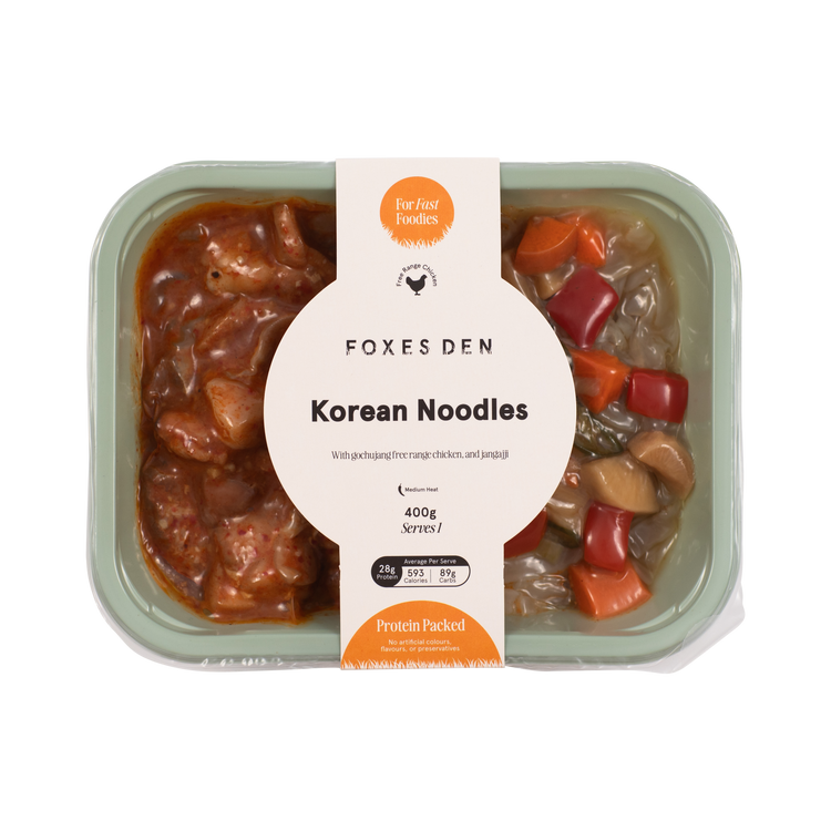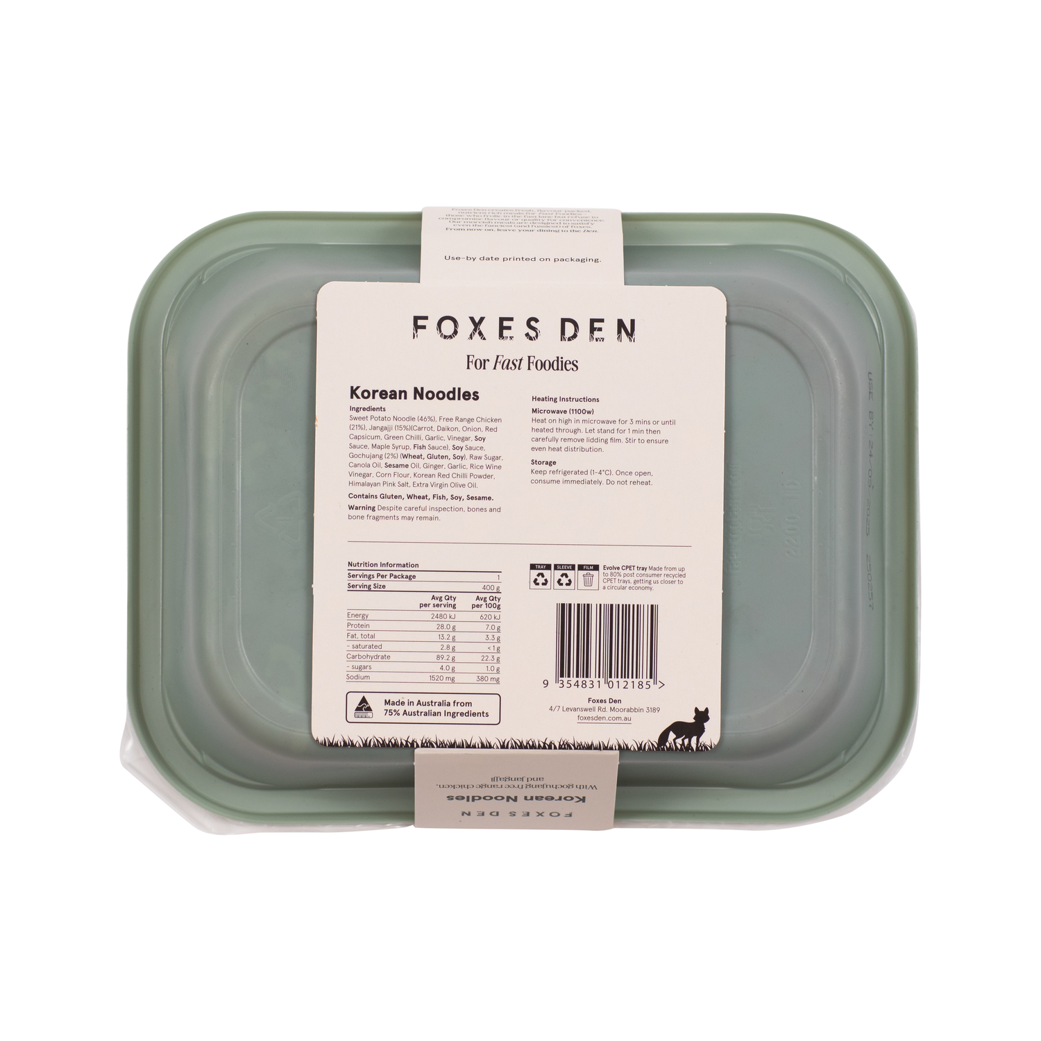 Sweet Potato Noodle (46%), Free Range Chicken (21%), Jangajji (15%)(Carrot, Daikon, Onion, Red Capsicum, Green Chilli, Garlic, Vinegar, Soy Sauce, Maple Syrup, Fish Sauce), Soy Sauce, Gochujang (2%) (Wheat, Gluten, Soy), Raw Sugar, Canola Oil, Sesame Oil, Ginger, Garlic, Rice Wine Vinegar, Corn Flour, Korean Red Chilli Powder, Himalayan Pink Salt, Extra Virgin Olive Oil.
